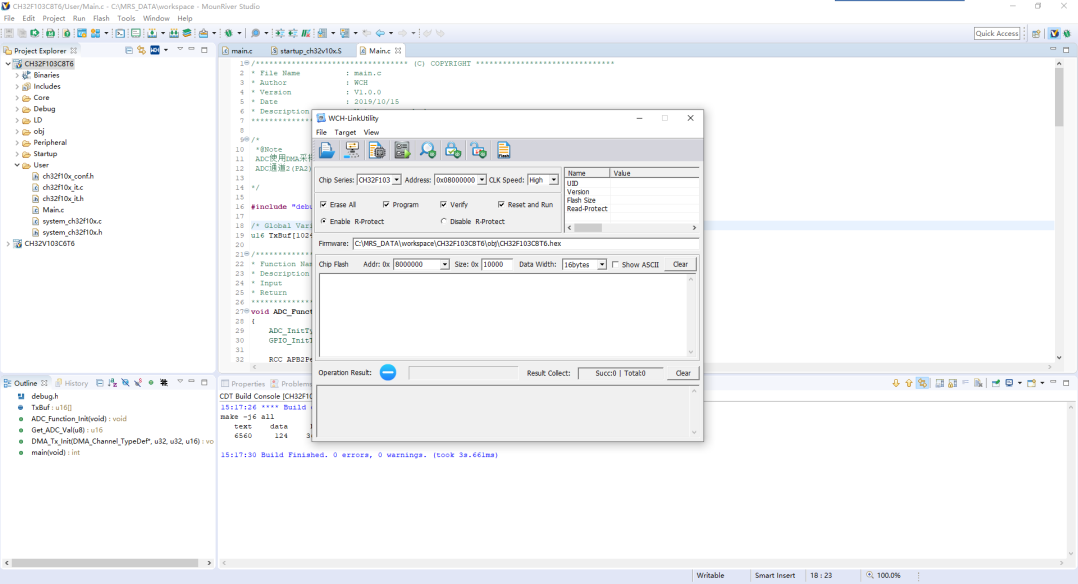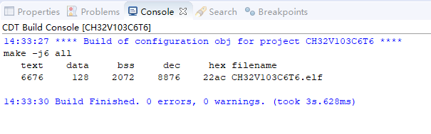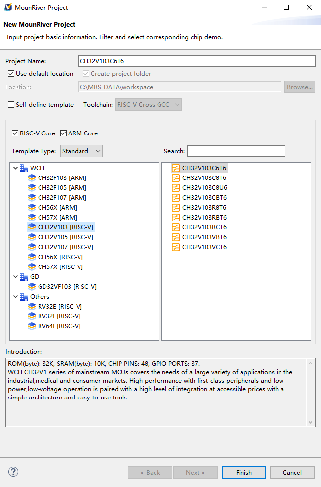 在工程模板页面有WCH和GD厂家的RISC-V系列MCU工程模板,型号还蛮齐全,更让人意外的是芯片列表中还有ARM内核的CH系列芯片(后来才发现是自己没仔细看MRS欢迎页的相关介绍),正好手头还有块CH32F103的板子,待会儿可以顺便试试用MRS来开发ARM内核的工程。当前我们继续CH32V103的开发,选择C6T6型号创建标准模板工程,编译~成功。