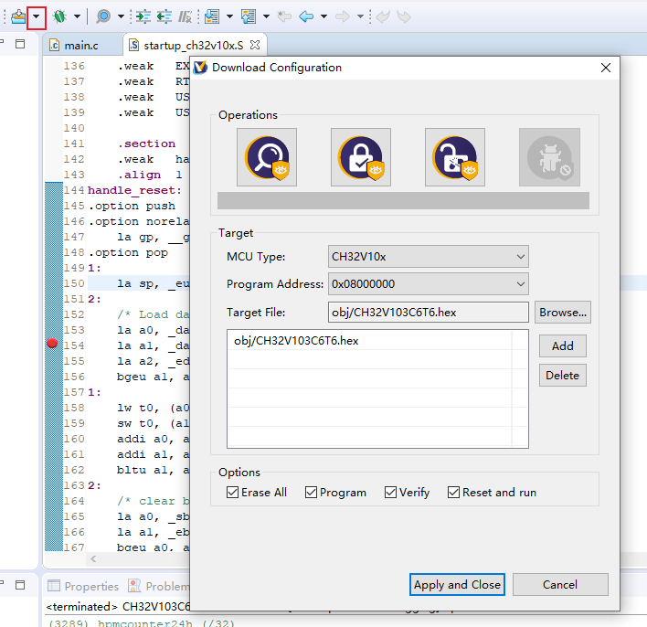 点击停止按钮,退出调试模式,接下来就是代码烧录功能测试了。找到工具栏代码下载按钮,点击右侧的三角按钮,打开下载配置界面,发现该页面集成了设备Flash读保护查询/设置,编程地址,擦除,编程,校验,复位运行等功能。