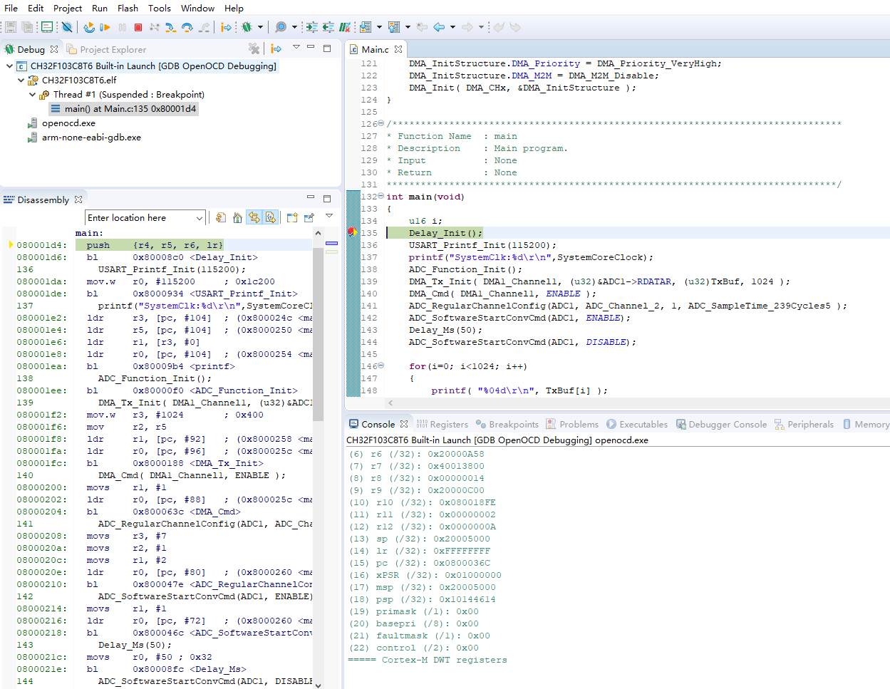 还真的是已经自动切换为ARM GCC工具链了,看来MRS在简化开发操作方面确实下了不少功夫。下面再来测试下MRS对ARM内核芯片的代码下载功能:WCH-Link需要切换到ARM模式,还是参考配套的说明文档,把TX接地后重新上电,调试器红灯、蓝灯常亮,切换成功。