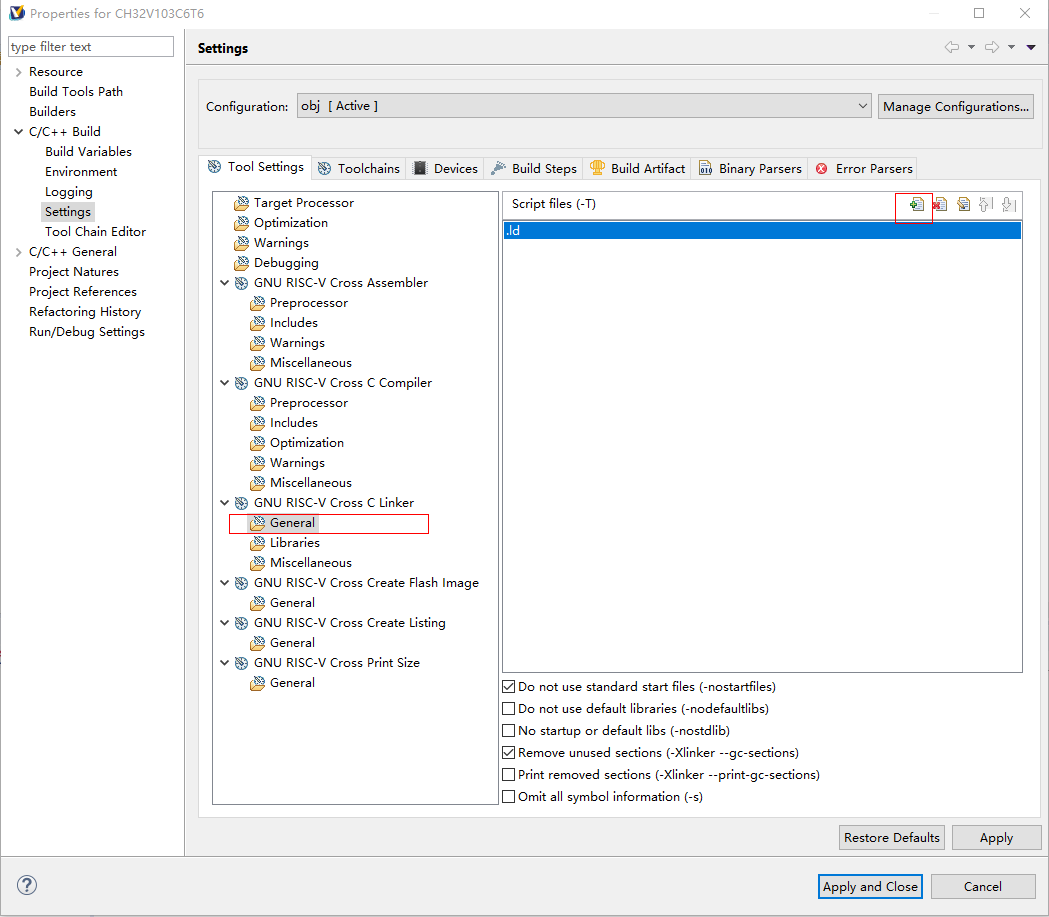 【链接脚本文件添加】红框中的位置分别为添加链接脚本文件接口,点击右侧方框上绿色的加号去添加文件路径。