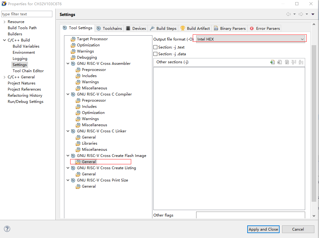 【输出文件格式】右侧红框中可点击下拉框选择编译后输出BIN文件或者HEX文件。