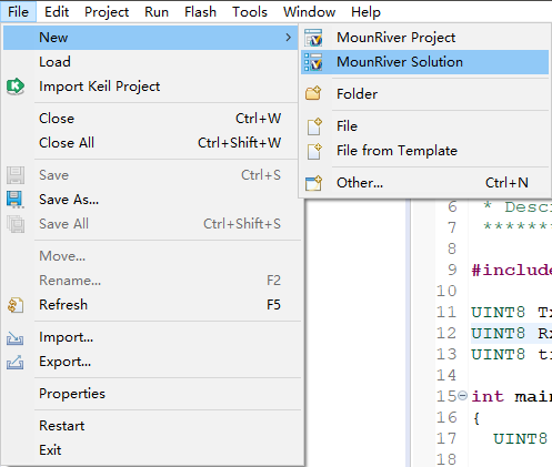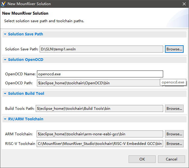 - 点击主菜单“File->New->MounRiver Solution”,弹出工程集配置对话框。