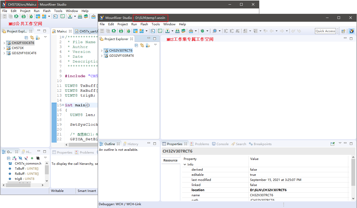 而同样基于Eclipse平台开发的MounRiver® Studio(MRS)则引入了嵌入式开发工程师熟悉的“工程文件”、“解决方案文件”概念,支持双击文件直接打开IDE并加载工程、工程集。