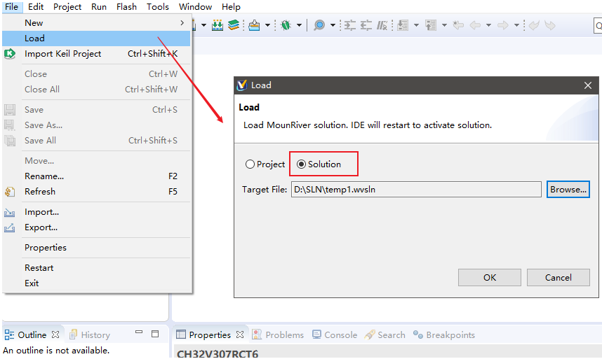 2.如果此时MRS已经打开,点击主菜单“File->Load”,打开工程/工程集加载界面。在该界面中点击“Solution”单选框,接着指定要加载的工程集文件,点击“OK”即可加载指定的工程集。