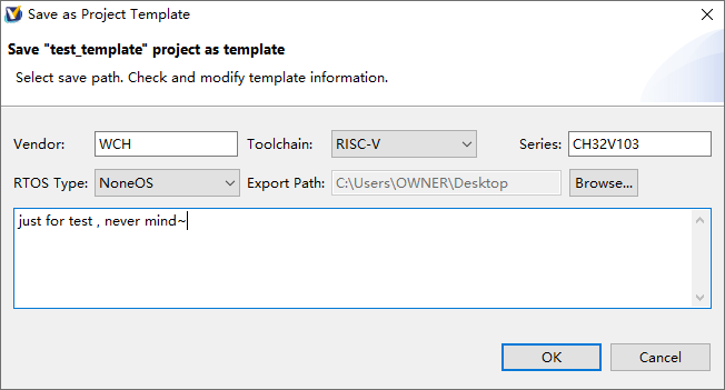 【浏览并编辑模板属性】弹出窗口中会显示当前工程的信息。如果工程来源是MRS模板创建的,会默认记录厂商、系列、描述等基本信息。用户可以浏览并修改这些信息。随后点击Browse…选择模板包的导出位置。配置无误后,窗体的OK按钮会使能,点击OK即可在指定位置生成模板包。导出模板包固定为工程名+ zip格式。