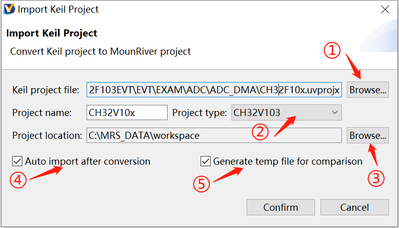 2、如下图所示,第①步选择Keil工程的工程文件。第②步选择要转换成的工程类型,目前仅支持CH32V103系列。第③步选择转换后的工程位置。第④步勾选后,转换后的工程会自动导入IDE。第⑤步勾选后,会生成语法转换前的中间文件。