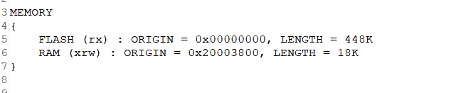 内存分配,FLASH只读可执行,起始地址为0x00000000.大小为448K,448K也可以写成16进制;RAM读写可执行,起始地址为0x20003800,大小为18K。