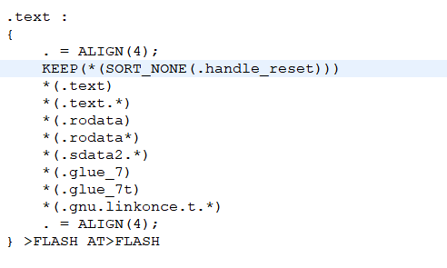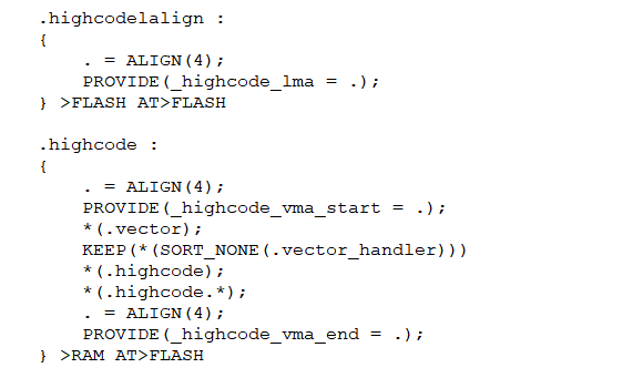 这两个段是将本来默认放在FLASH 中的代码放到RAM中去运行,.highcodelalign段起始地址4字节对齐,符号_highcode_lma是FLASH 中已经排布到的地址,注意.highcode段运行在RAM中,其中 ”.” 是在RAM中的地址,在这里就是RAM起始地址,_highcode_vma_start与此相同,在这个输出段中有 .vector .vertor_handler .highcode输入段,四字节对齐之后又提供了一个此段结束的地址_highcode_vma_end ,这两个输出段中定义的三个符号是为了将FALSH 中的代码搬运到RAM里取运行,同样可以在start_CH573.S中可以看到