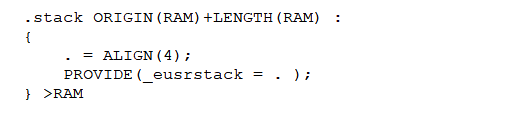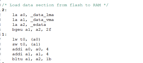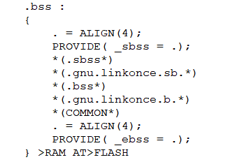 此三段可以看成一个部分,首先.dalign中”.”的值是一个表达式,ORIGIN(RAM)是RAM 的起始地址,MAX(0x800,SIZEOF(.highcode))代表0x800和.highcode段中的最大值, “.”等于两值相加,.dlalign定义了符号_data_lma,是FLASH排布到此处的地址,.data段中_data_vma与.dalign中的”.”地址相同,因为中间没有占用RAM区的数据,_data_vma,_data_lma,_edata,三个符号为搬运数据到RAM 中提供了地址,同样可以在start_CH573.S中可以看到