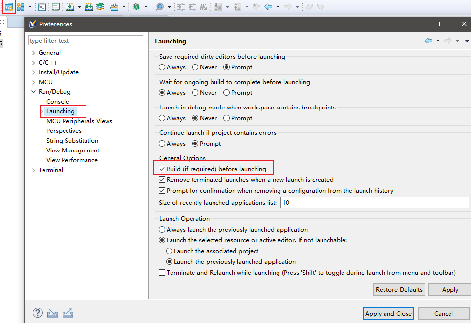 最后点击Apply and Close,应用改动之后的配置,这样下次我们再点击调试按钮时,MRS就不会在启动调试流程之前再自动编译一次。