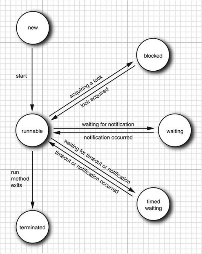 - 当一个线程在等待其它线程通知一个条件(condition)调度器,它进入了waiting状态。这是通过