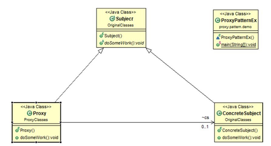 在之后的程序中,调用代理对象的doSomework(),然后它会调用真实对象的doSomework()。看到的输出是真实对象的输出。UML图中显示出了真实对象和代理对象是不在一个包中的