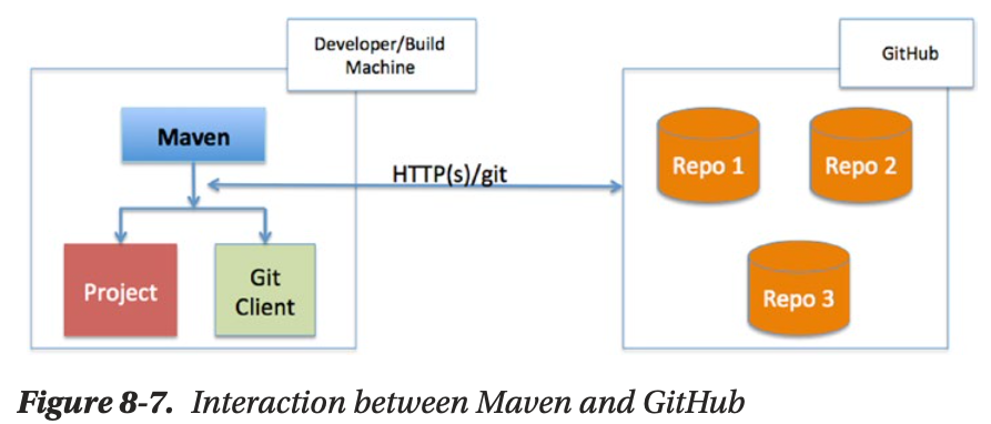Maven提供了release插件来提供上述步骤的标准的机制。假设你是用git作为scs,并且github是存放仓库的远程服务器。maven和github的交互方式图