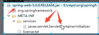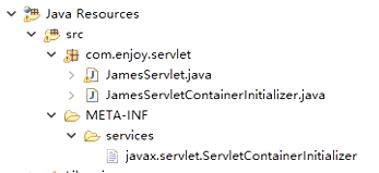 在src同级目录下建立META-INF文件夹,里面还有个services文件夹,中间有个javax.servlet.ServletContainerInitializer文件,其中定义了自定义的ServletContainerInitializer的全路径。