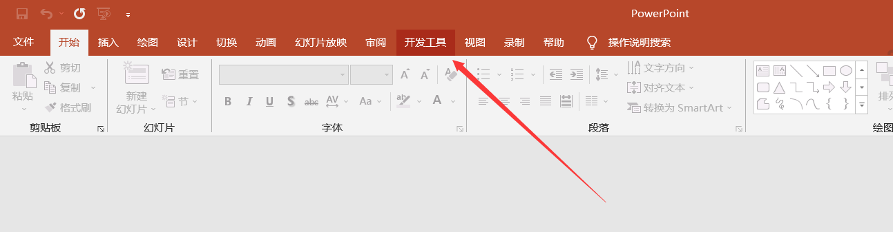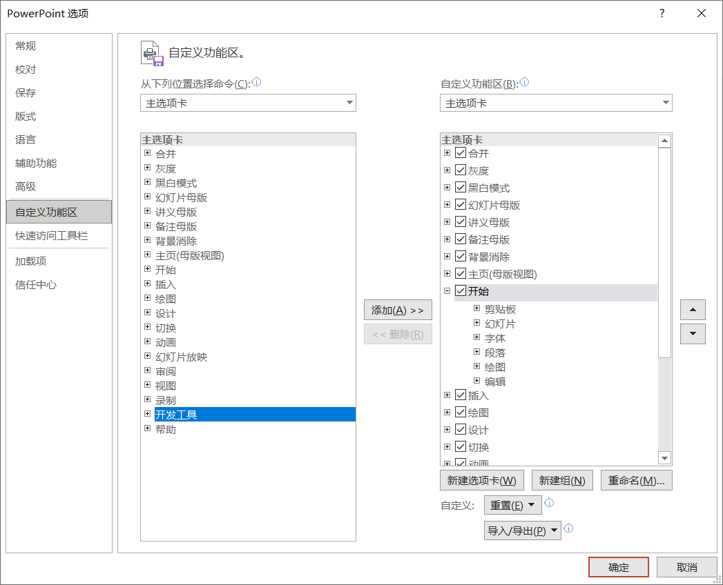 PowerPoint选项 》 自定义功能区 》 主选项卡 》 开发工具