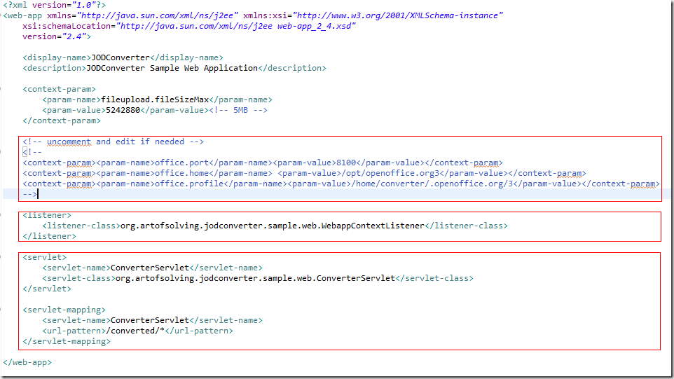 代码主要有两部分,第一部分是初始化文件上传的参数,设置最大允许上传的文件大小,第二部分根据web.xml文件设置的OpenOffice相关参数,初始化OpenOffice文档转换服务配置DefaultOfficeManagerConfiguration,并且构建一个OfficeManager和DocumentConverter的实例,这个两个类一个是用来根据DefaultOfficeManagerConfiguration启动OpenOffice文档转换服务,一个用来执行转换任务。