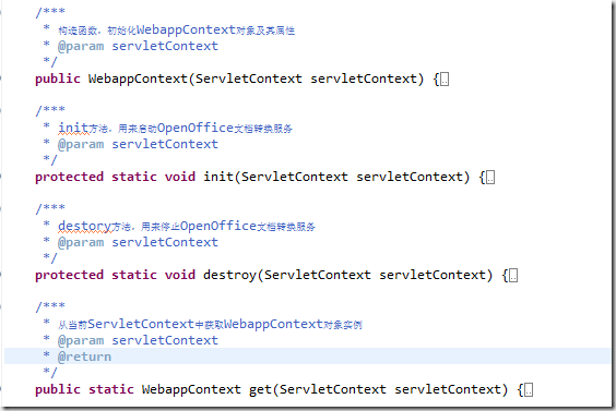 这个的代码更简单,就是实现了侦听器的两个方法,init方法和destory方法,并且分别调用了WebappContext类的init方法和destory方法,并且把当前ServletContext当作参数传递过去,可以知道重点在WebappContext类里面,打开WebappContext类,里边主要有四个方法: