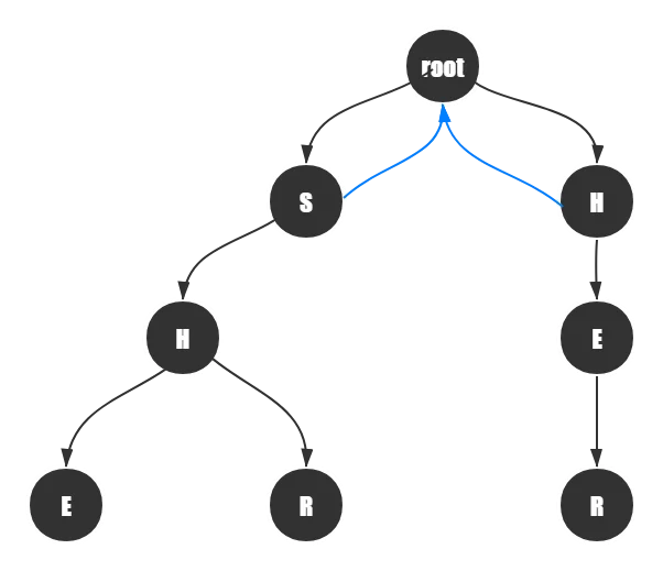 “我会暴力查询!”,直接从根节点出发,按照Trie树的顺序依次向下查询,经过\(H->E->不匹配R\)无法到达目标,返回根节点。