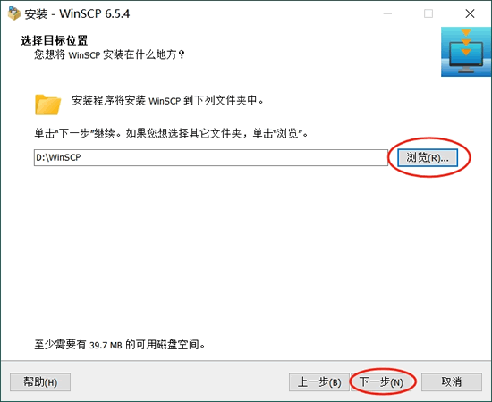 ④ 在下图窗口中,点击“浏览”按钮可以自定义 WinSCP 的安装位置,这里建议安装到除 C 盘以外的其它盘里,比如笔者选择安装到 D 盘。然后点击“下一步”: