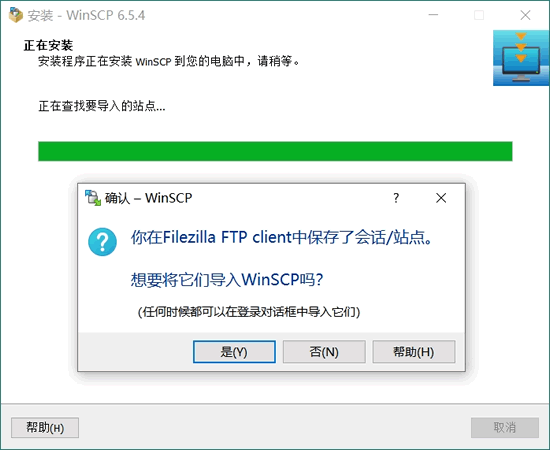 ⑨ 等待安装完成。如果电脑安装了 PuTTY 或者 Filezilla,会自动弹出“是否导入站点”对话框,点“是”可以自动同步保存的 SSH 会话:
