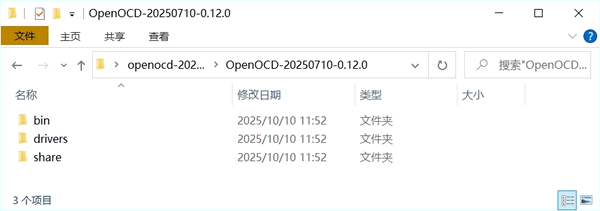 1) 解压下载的 openocd-20250710.7z,得到的文件夹如下图所示: