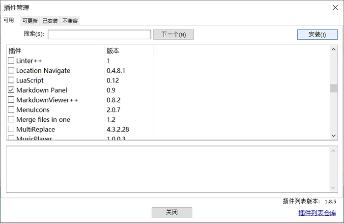 2) 在插件列表中,勾选 Markdown Panel,然后点击“安装”: