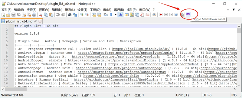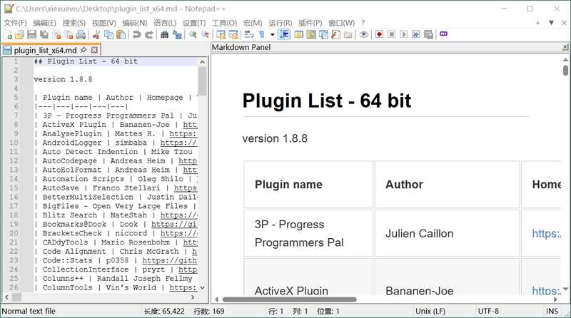 Notepad++ 官方提供了很多功能实用的插件,它们全部记录在了名为“plugin_list_xxx.md”的文件里,此文件是 MarkDown 格式的:通过为 Notepad++ 添加插件,它就可以正常打开 md 文件,接下来为大家演示安装插件的具体过程:
