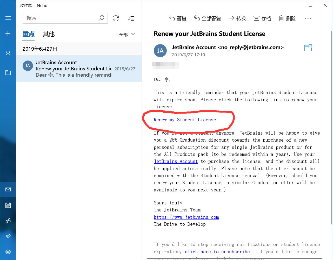 之前我碰到过这种问题,就是大学生激活IDEA等产品,只能用一年,之后就需要重新激活,只要你还是学生,还是可以免费激活的,可是在网上百度到的方法都是破解的方法,我也找了半天的解决方法,毕竟JetBrains的官网都是英文的,很难摸索,后来一不小心登录到了自己的学生邮箱,发现有过期提示的邮件。
