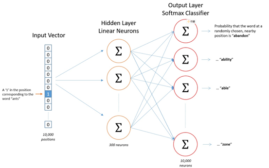 如果我们现在想用300个特征来表示一个单词(词表大小为10000)。那么隐层的权重矩阵应该为10000行,300列(隐层有300个结点)