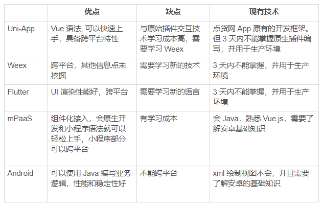我们开始筛选市面上各类跨平台的 App 开发技术,在此期间对比了 Uni-App、Weex、Flutter、mPaaS 等跨平台开发框架。