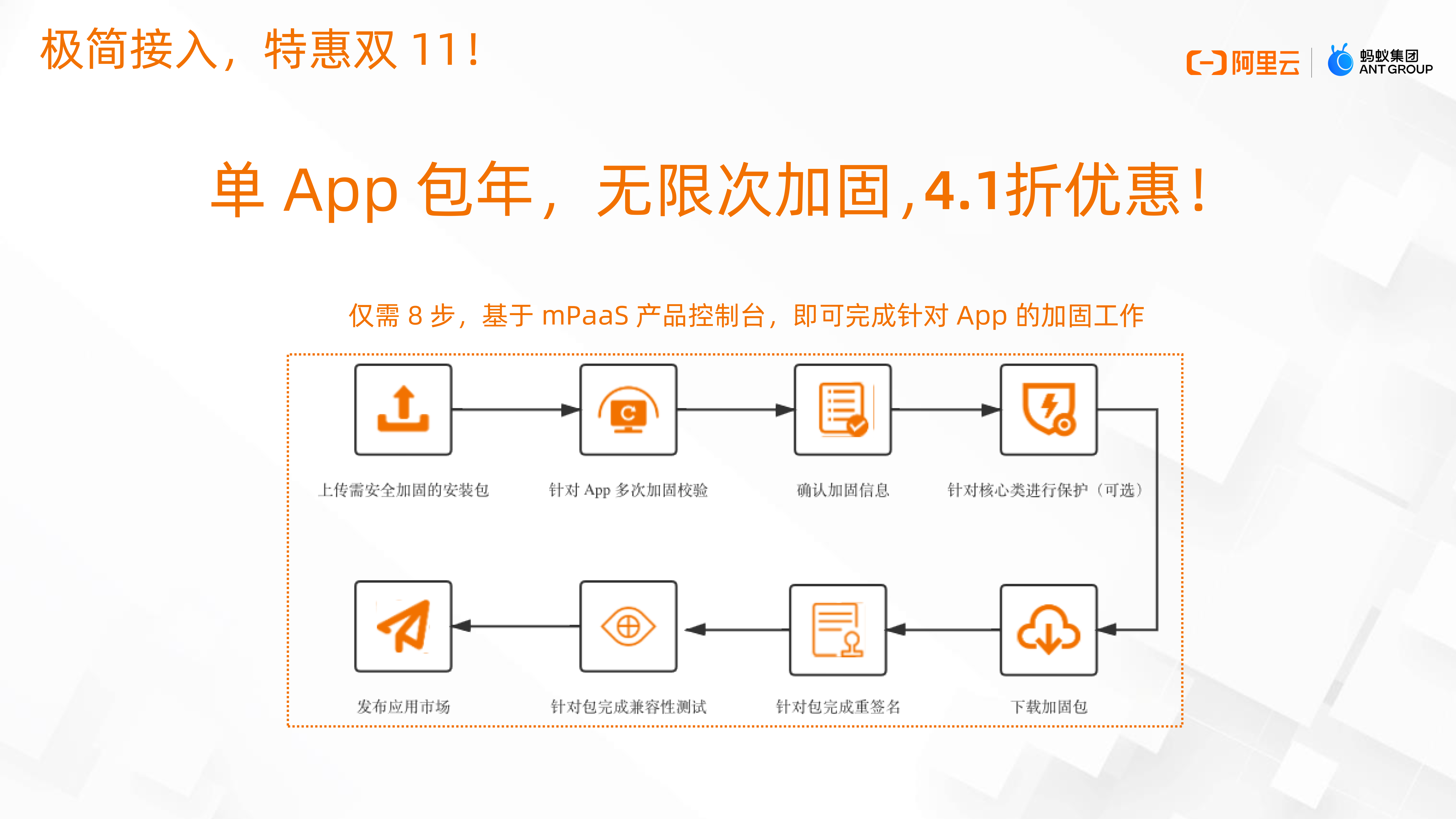 移动应用安全加固,接入简单,只需 8 步即刻完成。而且在双 11 来临之际,mPaaS 移动安全加固将正式在阿里云上线,欢迎大家接入试用。