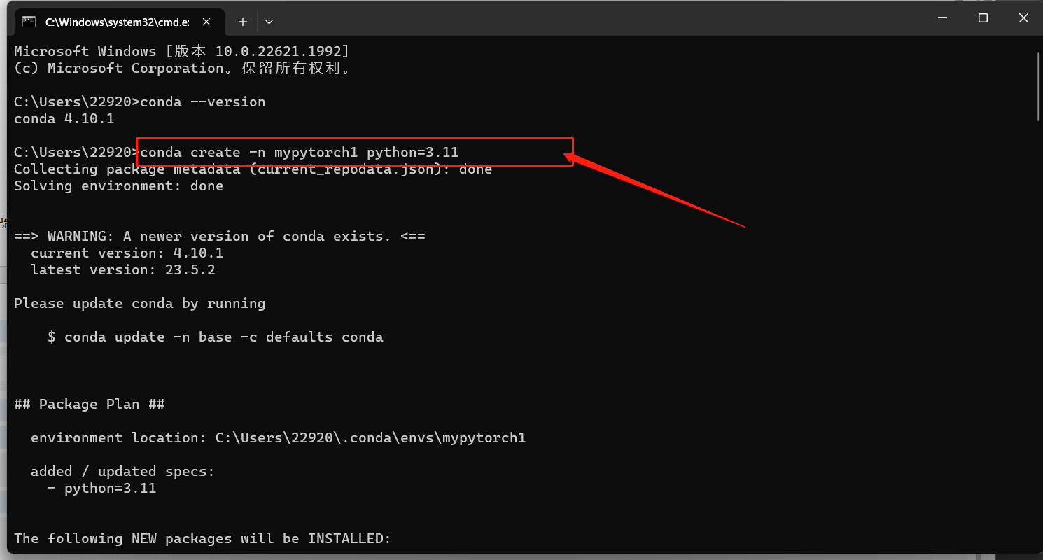 上面的命令是创建一个conda环境,名称是mypytorch1,其中python的版本是3.11,这个版本可以自己制定,创建截图如下所示