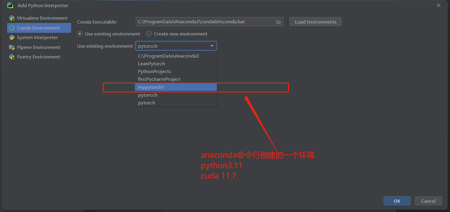 上面在anaconda命令行创建环境后这里就有已经存在的环境了,可以看到我最前面创建的mypytorch1,选择这个环境