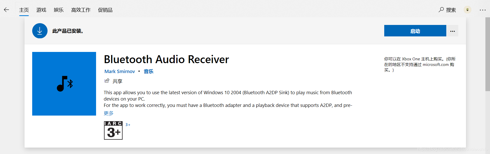 首先,我们打开Microsoft Store,搜索“Bluetooth Audio Receiver”软件。因为我这里已经安装过这一软件了,所以和大家搜索出来的情况会不太一样,大家参考下图即可。如果大家的电脑无法打开Microsoft Store,那可以到网上搜索一下“Bluetooth Audio Receiver”软件,我看不少软件网站都提供了直接下载其安装包的选项。