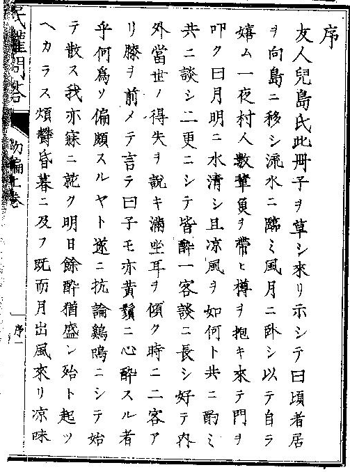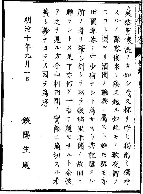 友人兒島氏草此冊子來示,曰:頃者移居於向島,臨流水臥清風以自嬉。一夜,村人數輩帶魚抱樽而來,叩門曰:“月明水清,且如何與涼風共酌共談乎?“二更後皆醉,一客好長談,說內外當世之得失,滿坐傾耳時,二客言於膝前,曰:“子亦心醉黃鬚者乎?何为偏颇也?”遂抗論,雞鳴始散,我亦就寐。明日餘醉猶盛,殆不能起,及煩鬱昏暮。既而月出風來,凉味爽然,胸怀如洗。乃又呼杯獨酌獨吟之際,客復來而談又起。如此數夜謂者,故屬酒間之雜興。雖然亦田園草莽之中,非為少補,筆刻其記憶所之者,以贈我鄉里未開之故舊,足下亦何乎?題一言則余披而見之。方今適切山村田間之實際者,蓋不尠矣,因而為序。