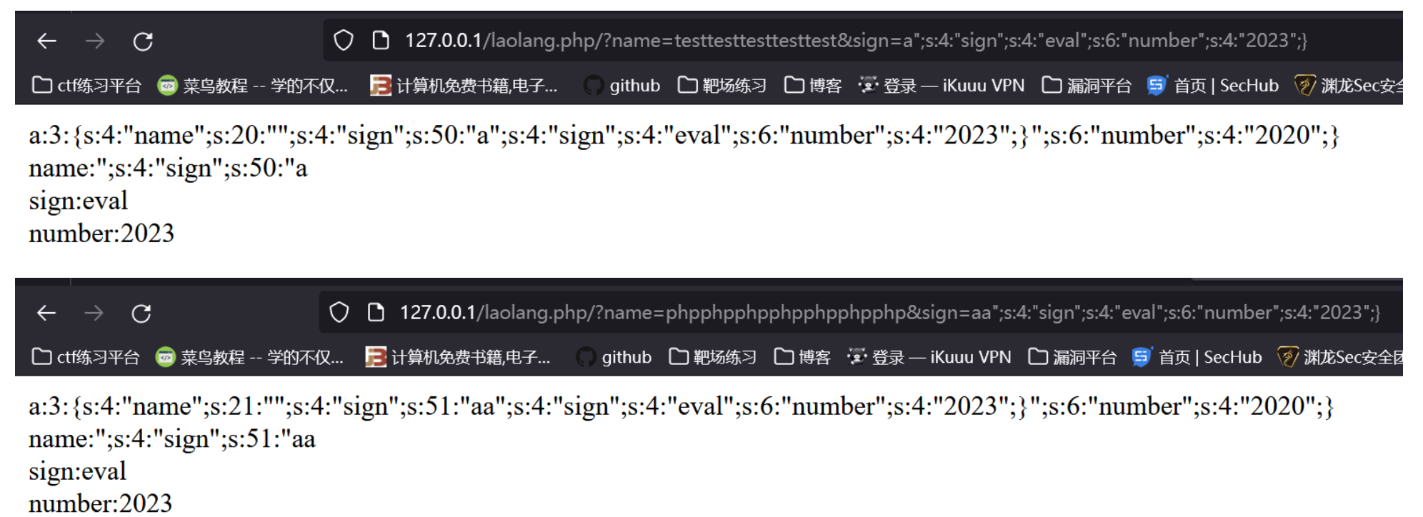 O:1:"A":2:{s:4:"name";s:6:"aaaaccc";s:4:"pass";s:6:"123456";} //这里我们可以看到aaaaccc明明是7个字符,但前面标的仍然是6个,这里就逃逸出来一个字符。