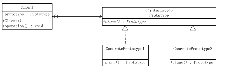 (2)抽象原型(Prototype)角色:这是一个抽象角色,通常由一个Java接口或Java抽象类实现。此角色给出所有的具体原型类所需的接口。