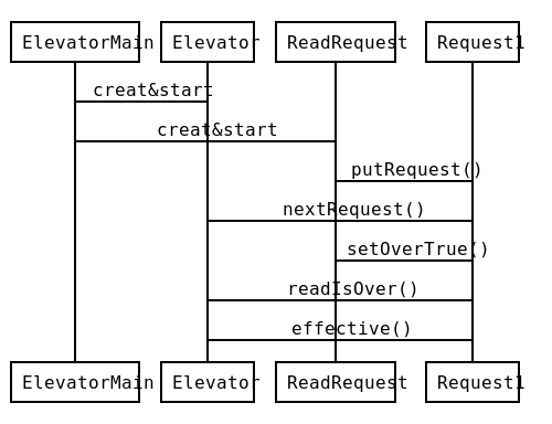 这里有五个类,Request,ReadRequest,Scheduler,Elevator,ElevatorMain,其中,ReadRequest,Scheduler,Elevator三个是继承于线程类。各自的功能就是,Request实际上是一个请求队列,里面增加了一些同步了的队列操作,ReadRequest读取请求,Scheduler将第一个队列的请求加入第二个队列,Elevator是执行电梯运行,ElevatorMain是执行创建并启动三个线程。