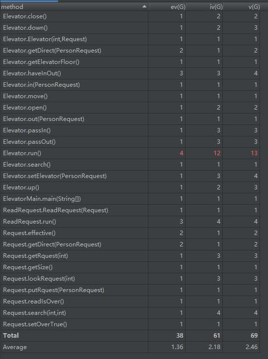 可以看到电梯的函数to,复杂度爆了,这其实和第二次作业中的电梯run()函数爆的原因一样,需要判断的东西太多了,可以看到iv和v值几乎和上一次电梯的run()一模一样。其实to函数就是上次电梯run函数抽象出来的内容。