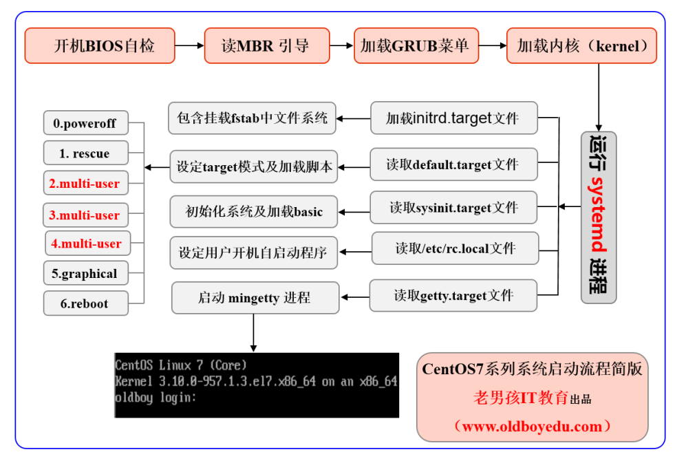 6) systemd执行multi-user.target下的gtty.target及登录服务。