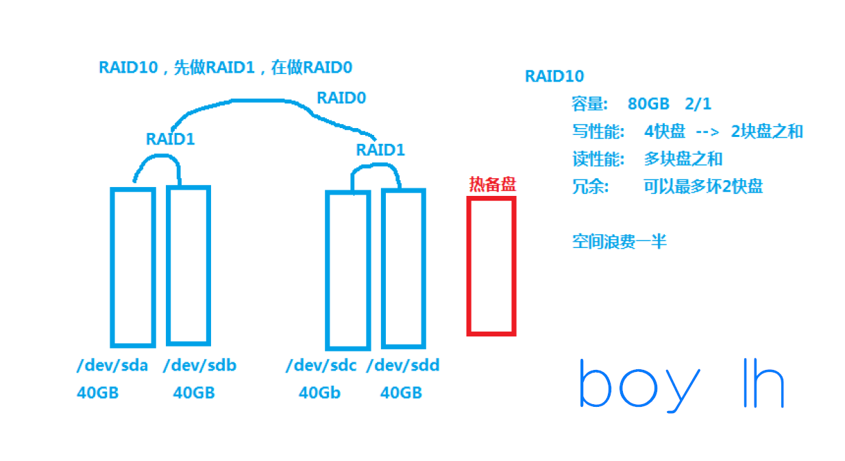 raid 0与raid 1组合,读多盘之和,写1/2,容量1/2,,可坏两块盘(同一个raid0里)。至少四块盘,需做热备盘 |
