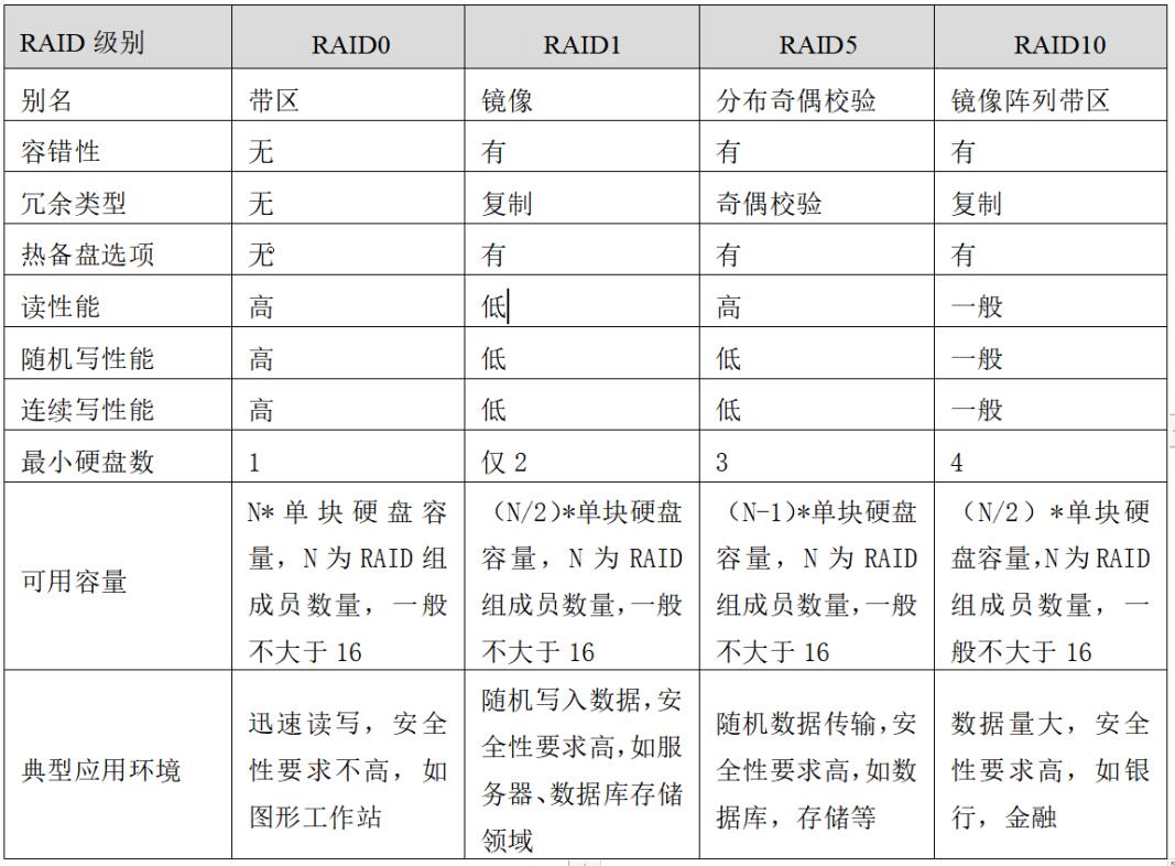 raid 1与raid 0组合,读写性能都不错,容量1/2,冗余,可坏两块盘。至少四块盘,需做热备盘 |