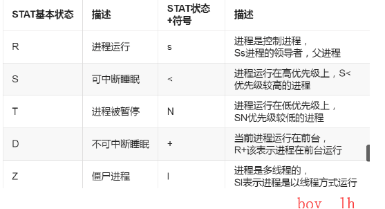 S 进程状态。D=不可中断的睡眠状态 R=运行 S=睡眠 T=跟踪/停止 Z=僵尸进程。