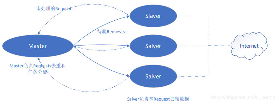 如图3首先Salverr端从Master端拿任务(Request、url)进行数据抓取,Salverr抓取数据的同时,产生新任务的Request便提交给 Master 处理。