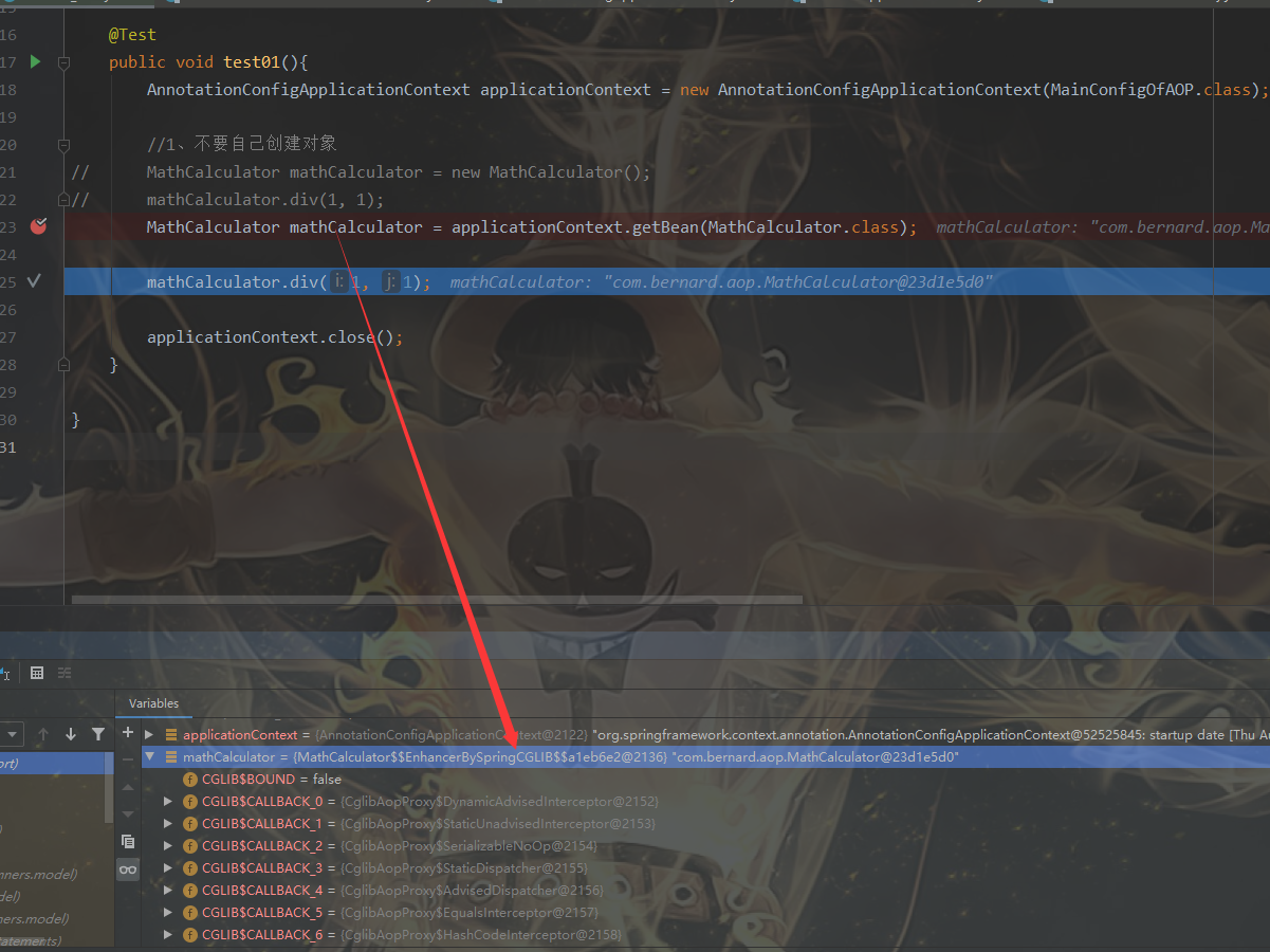 最后我们在执行目标方法前打上断点,查看从容器中获取的MathCalculator对象是什么