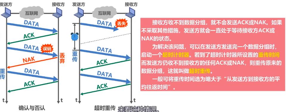 发送发给接收方发送数据分组,接收方收到后进行差错检测,若没有误码,则接收该数据分组,并个发送方发送确认分组(ACK),发送方再继续发送;若有误码,则给发送方发送否认分组(NAK),发送方重传
