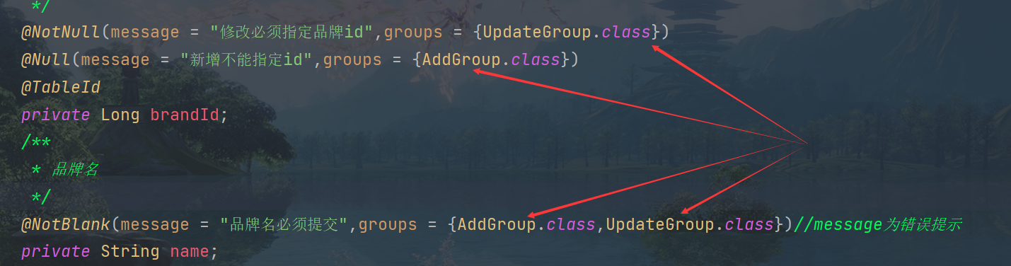 import static java.lang.annotation.ElementType.ANNOTATION_TYPE; import static java.lang.annotation.ElementType.CONSTRUCTOR; import static java.lang.annotation.ElementType.FIELD; import static java.lang.annotation.ElementType.METHOD; import static java.lang.annotation.ElementType.PARAMETER; import static java.lang.annotation.ElementType.TYPE_USE; import static java.lang.annotation.RetentionPolicy.RUNTIME; import java.lang.annotation.Documented; import java.lang.annotation.Repeatable; import java.lang.annotation.Retention; import java.lang.annotation.Target; import java.util.Arrays; import javax.validation.Constraint; import javax.validation.Payload; import javax.validation.constraints.NotBlank.List; /** * 自定义校验注解 * * @author 江南大学1033190417 * @date 2022/6/7 1:02 */ @Documented @Constraint(validatedBy = {})//用什么校验器来校验 @Target({METHOD, FIELD, ANNOTATION_TYPE, CONSTRUCTOR, PARAMETER, TYPE_USE}) @Retention(RUNTIME) public @interface ListValue { String message() default "{com.atguigu.common.valid.ListValue.message}"; Class<?>[] groups() default {}; Class<? extends Payload>[] payload() default {}; int[] vals() default {};//新添加属性 }