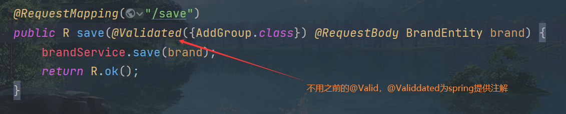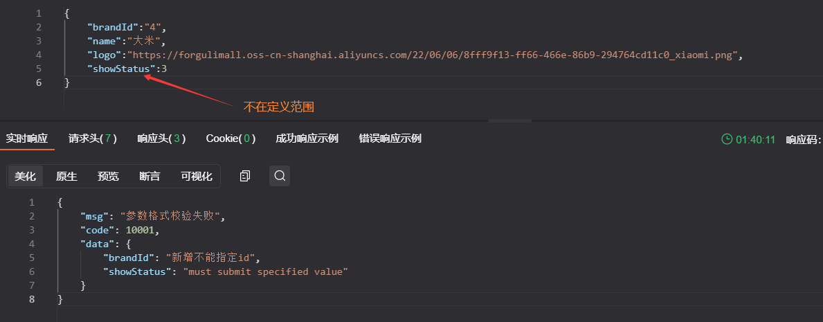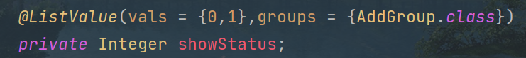 //ConstraintValidator<ListValue,Integer>: 值1:自定义接口,值2:需要校验的数据类型 意思来源可以在ConstraintValidator的解释中看到 public class ListValueConstraintValidator implements ConstraintValidator<ListValue, Integer> { private Set<Integer> set = new HashSet<>(); //初始化方法 @Override public void initialize(ListValue constraintAnnotation) { int[] vals = constraintAnnotation.vals(); for (int val : vals) { set.add(val); } } //判断是否校验成功 /** * * @param value 需要校验的值 * @param context 上下文环境 * @return */ @Override public boolean isValid(Integer value, ConstraintValidatorContext context) { return set.contains(value); } }