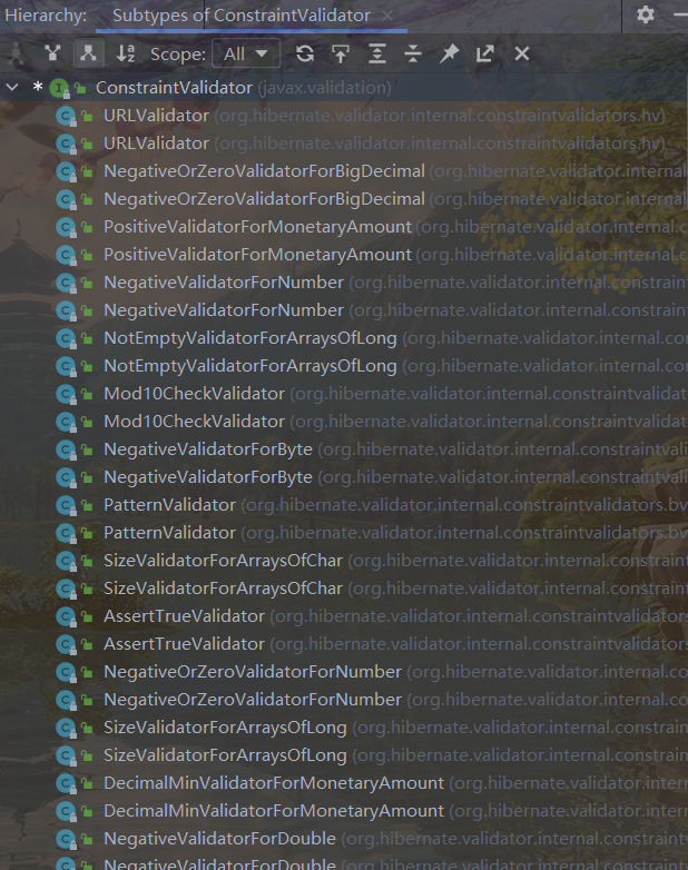 扩:一些其他的校验器,在idea中在 ConstraintValidator 上Ctrl+h可以查看其所有实现
