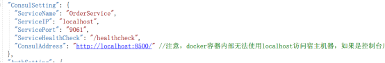 "ConsulAddress": "http://localhost:8500/" //注意,docker容器内部无法使用localhost访问宿主机器,如果是控制台启动的话就用localhost